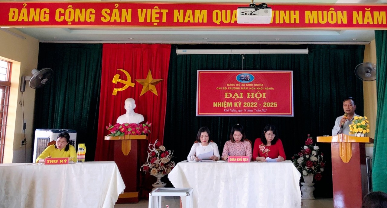 Thực hiện Kế hoạch của BCH Đảng bộ xã Khởi Nghĩa về việc tổ chức đại hội các chi bộ trực thuộc Đảng bộ cơ sở nhiệm kỳ 2022- 2025. Hôm nay ngày 14 tháng 7 năm 2022 chi bộ trường Mầm non Khởi Nghĩa long trọng tổ chức Đại hội chi bộ nhiệm kỳ 2022- 2025.