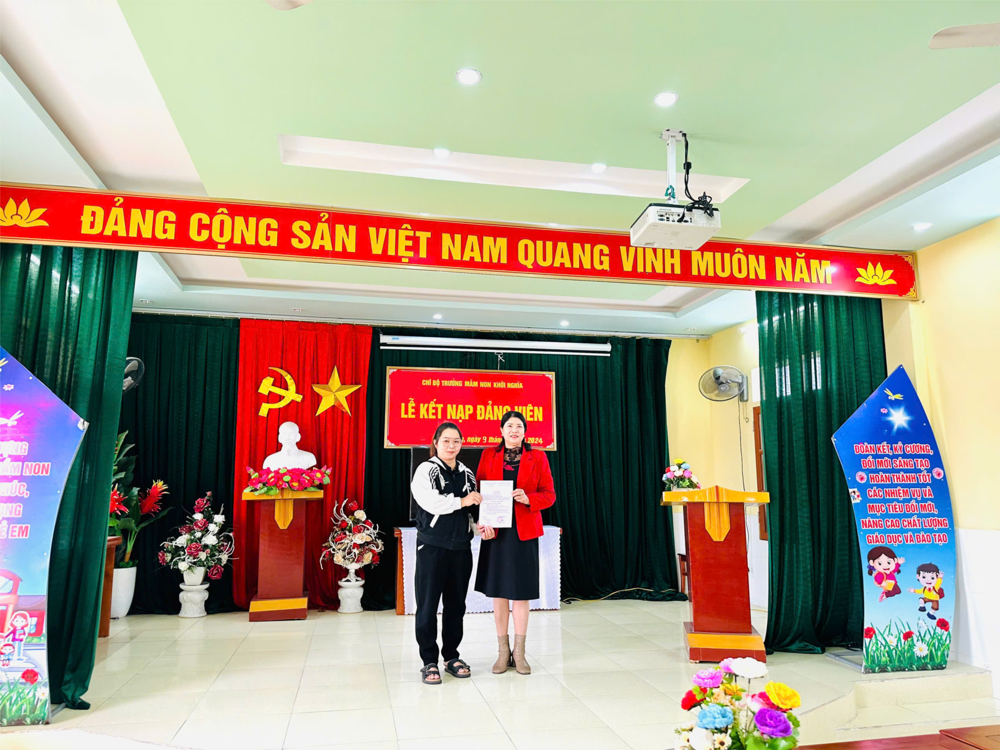 Thực hiện Điều lệ Đảng và các quy định của Trung ương về kết nạp đảng viên mới, sáng ngày 09/12/2024, được sự đồng ý của Đảng uỷ xã Khởi Nghĩa chi bộ trường mầm non Khởi Nghĩa đã tổ chức Lễ kết nạp đảng viên mới cho quần chúng Nguyễn Thị Thơm Giáo viên lớp 3B3