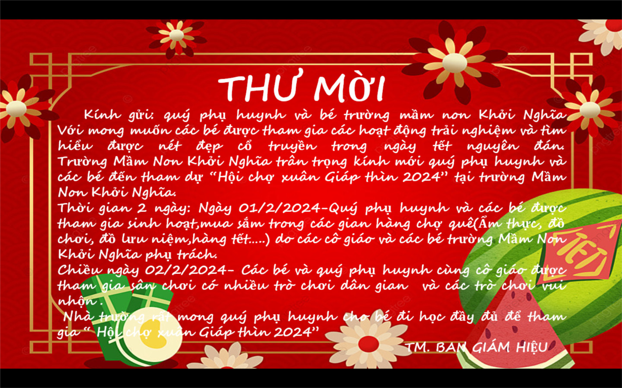 Hội chợ xuân Giáp thìn 2024 được tổ chức trong ngày mùng 1,2 tháng 2 năm 2024 tại trường mầm non Khởi Nghĩa đã diễn ra thành công tốt đẹp. Qua hội chợ xuân các bé đã được trải nghiệm và tìm hiểu, biết được nét đẹp cổ truyền trong ngày tết nguyên đán.